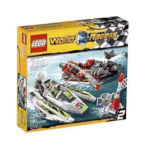 World Racers Jagged Jaws Reef Cutting from the waves at high speed, the red team boat is fighting off a shark attack with a harpoon while the green team boat launches fish missiles to try and gain the upper hand. But who will probably be the first to arrive at the trophy attached on the buoy far out on the open ocean!? Features Includes 2 minifigures: 1 green team driver and 1 red team driver Build 2 race boats: Green team boat with fish missile launcher and red team boat with harpoon Buoy and trophy included Look out to the shark 191 LEGO pieces